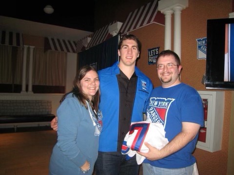 Photos: First photo to left: Stacie and Jonathan Newman, with former Ranger Ryan McDonagh (m). Credit: Rose Donovan.