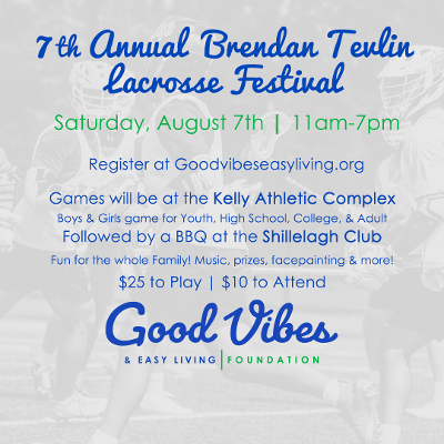 After not hosting the Annual Brendan Tevlin Good Vibes & Easy Living Lacrosse Festival last year due to the COVID-19 pandemic, the yearly event will be back on Saturday, August 7th, from 11 a.m.-7p.m. on the Brendan Tevlin Field at the Kelly Athletic Center in West Orange, N.J. Games will be followed by a BBQ at the nearby Shillelagh Club.
