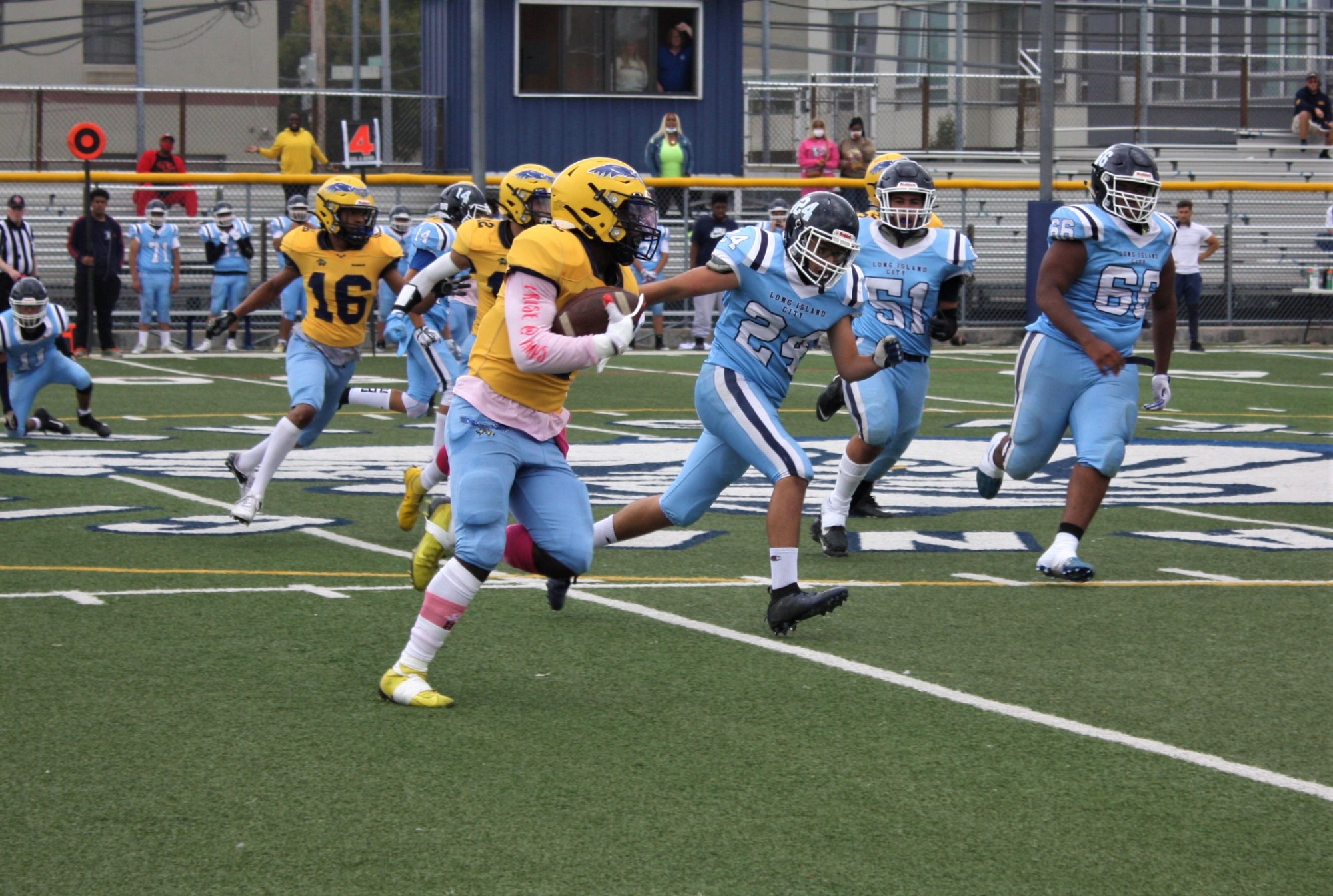 Freshman Roman Summers recovered a fumble at the Falcons’ 49. After a few plays, Clifford “CJ” Smith, whose dad is Mr. Vegas, a popular Jamaican reggae singer, bolted for a nifty 32-yard rushing score, his first of the year, to swell the advantage to 42-0 at the half.