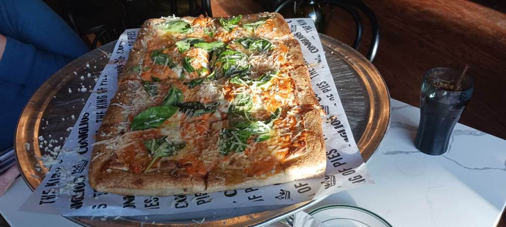 My girlfriend, Maggie and I ordered the Vodka Stracciatella Square Pie–vodka sauce, mozzarella, stracciatella and basil.