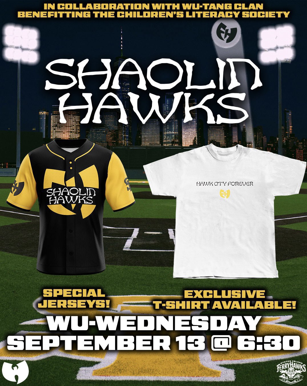With Wu-Tang continually referring to Staten Island as “Shaolin,” the FerryHawks will transform into the Shaolin Hawks for this special night. FerryHawks players will sport exclusive black and yellow, Wu-Tang-inspired jerseys that will then be auctioned off to benefit the Children’s Literacy Society. The iconic group, along with Nas, is currently on its 2023 N.Y. State of Mind Tour, with stops at Madison Square Garden (Sept 15) and Barclays Center (Sept 27) lined up this month.