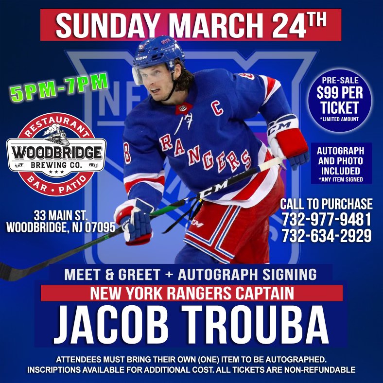 On Sunday, March 24th, New York Ranger defenseman and captain Jacob Trouba will be at Woodbridge Brewing Co. (33 Main Street in Woodbridge, N.J.) for a meet-and-greet autograph session.