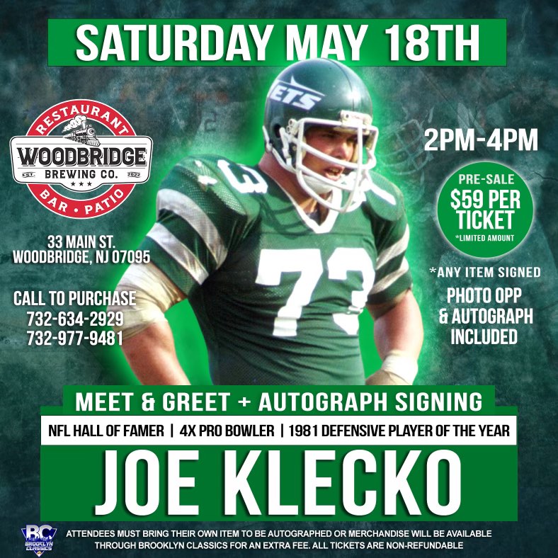 Woodbridge Brewing Co. (33 Main Street, Woodbridge, N.J.) has two upcoming, awesome signing events: the first on Saturday, May 18th, from 2:00 p.m. to 4:00 p.m., as former New York Jets legendary defensive lineman Joe Klecko will be on hand for a meet-and-greet autograph session.