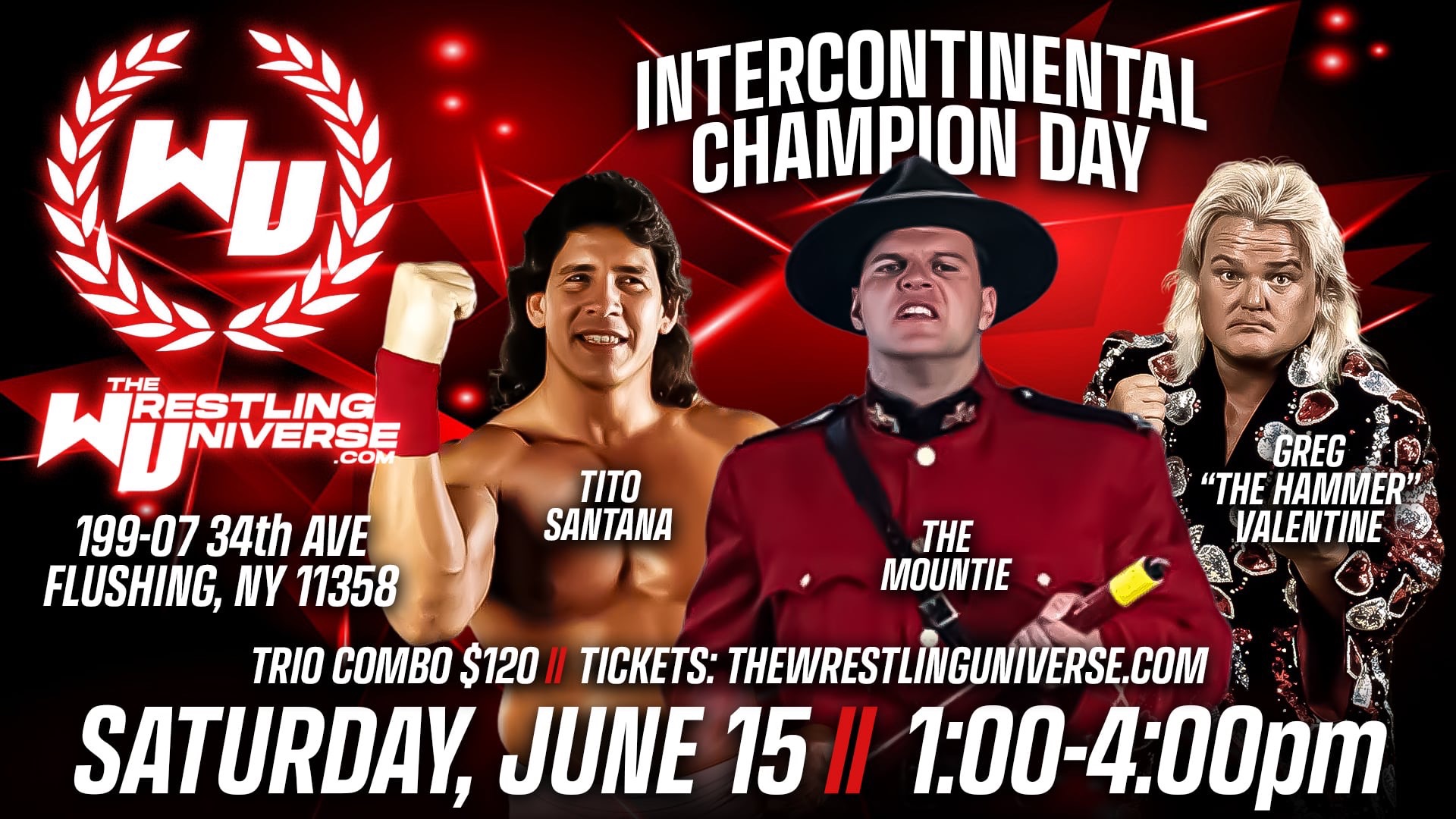 On Saturday, October19th (new date), from 1:00 p.m. to 4:00 p.m., the Wrestling Universe (199-01 34th Ave, Flushing N.Y.) will host three former WWE (then-World Wrestling Federation – WWF) Intercontinental Champions: Tito Santana, Greg “the Hammer” Valentine and The Mountie. The three legends will be on hand to meet-and-greet fans and sign autographs.