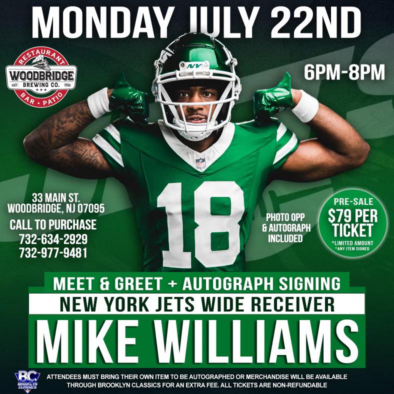 New York Jets wide receiver Mike Williams will be making an appearance at Woodbridge Brewing Co. (33 Main Street) on Monday, July 22nd from 6:00 p.m. to 8:00 p.m.