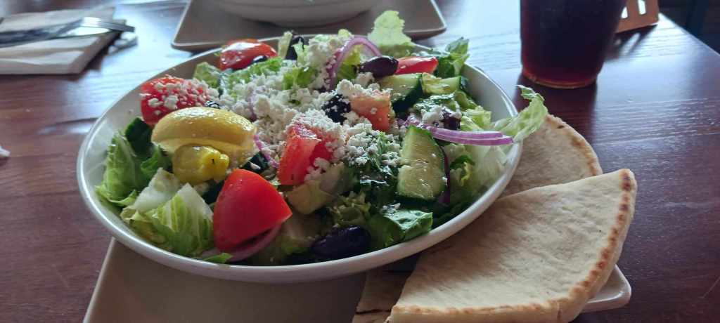 Also, the Greek salad was served with a grilled pita bread and its homemade Greek vinaigrette.