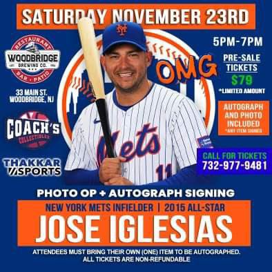 On Saturday, November 23rd, from 5p.m. to 7p.m., New York Mets free agent infielder and singer known by his stage Candelita, Jose Iglesias will be meeting and greeting fans at Woodbridge Brewing Co. at 33 Main Street in Woodbridge New Jersey.