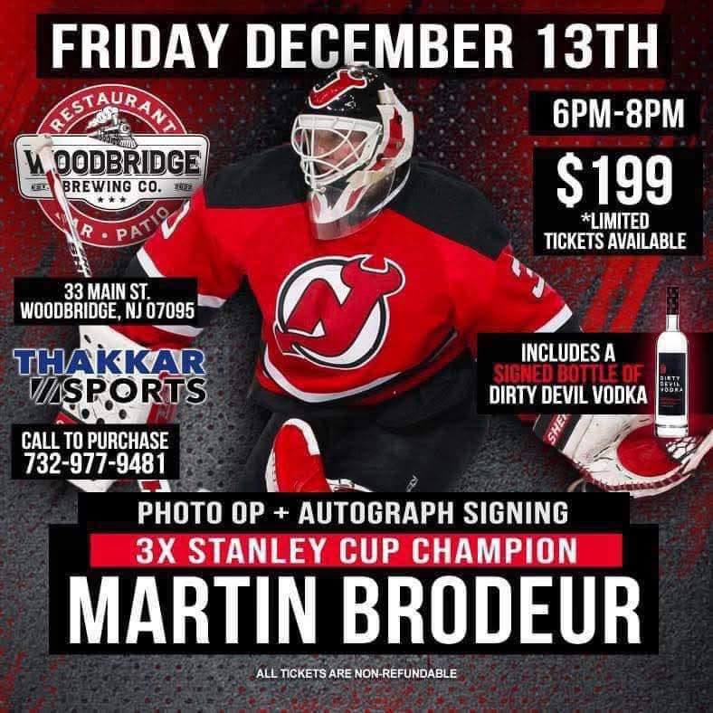 On Friday, December 13th, from 6:00 p.m. to 8:00 p.m., arguably one of the greatest goaltenders of all time, Martin Brodeur will be signing autographs at a special event at Woodbridge Brewing Co. (33 Main Street), in Woodbridge, N.J.