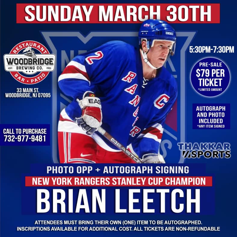 On Sunday, March 30th, 5:30 p.m. – 7:00 p.m., New York Rangers defensive icon and NHL Hall of Famer Brian Leetch will make an appearance at Woodbridge Brewing Co. for a special meet-and-greet event.