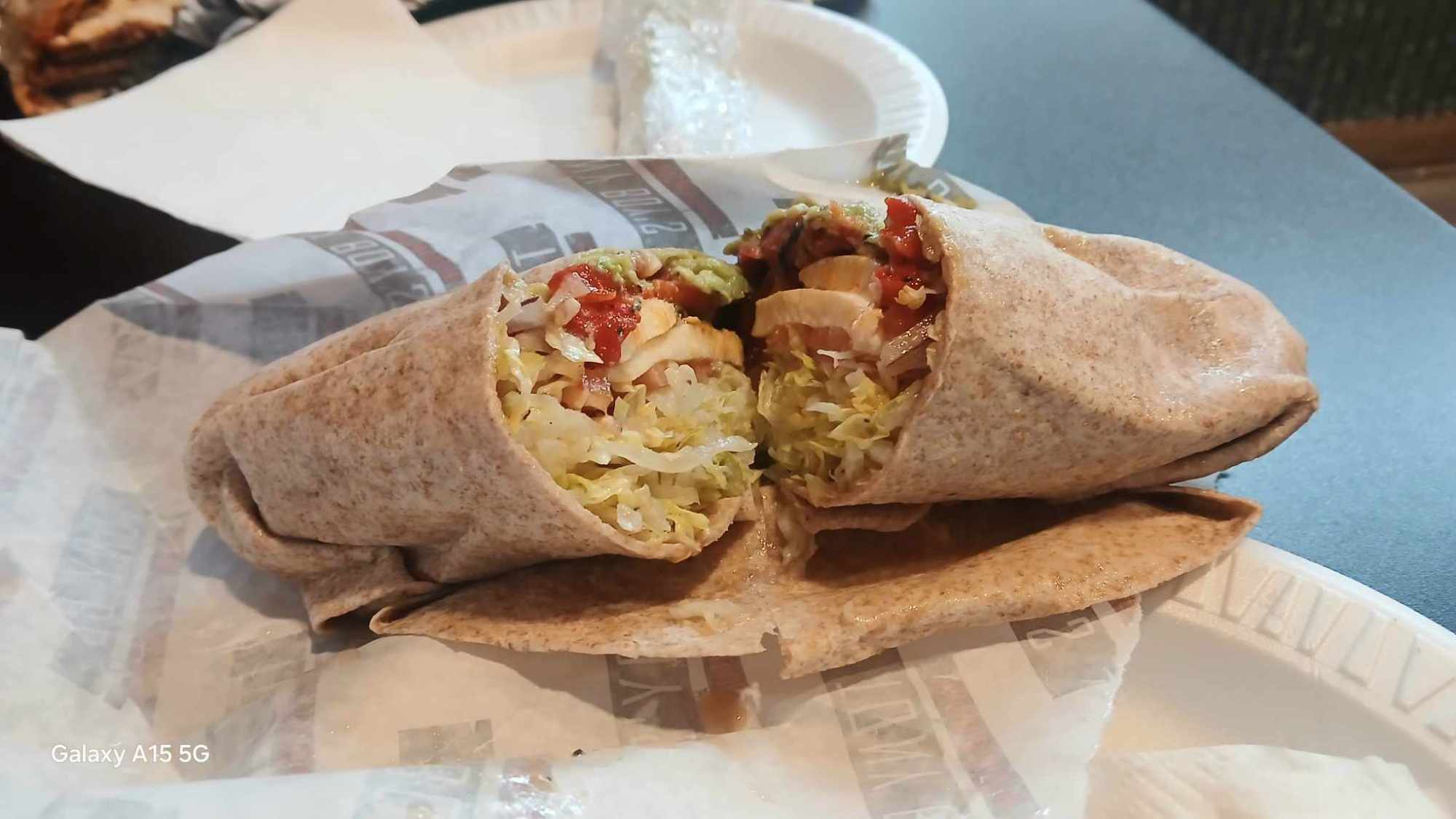 I ordered the Shrek Wrap — a whole wheat wrap with avocado, shredded lettuce, tomato, red onions, fresh mooz, roasted peppers and red wine vinaigrette.