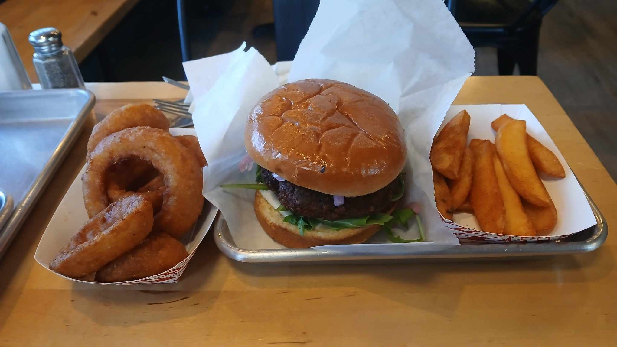 For the non-carnivore people, such as myself, there is the Enchanted Garden V–a falafel burger with hummus, garlic ailoli, avocado, arugula, and house pickled onions. I enjoyed this vegan burger, a dish left over from the Hidden Chickpea, and found it to be something I would go back and get again.