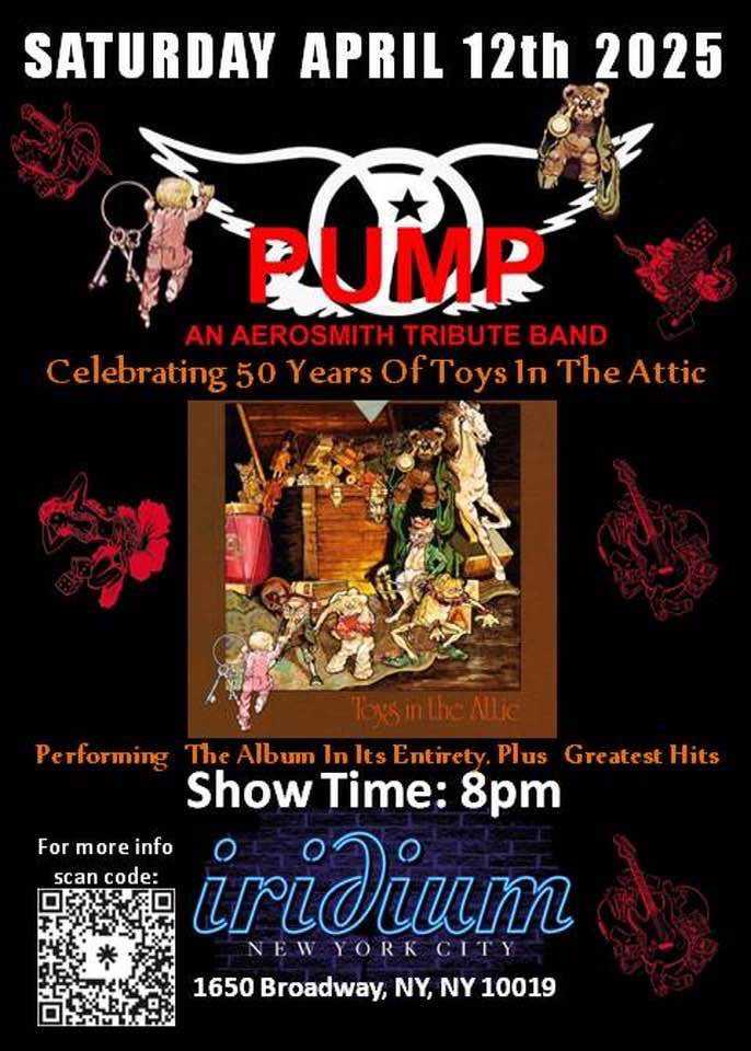 On Saturday, April 12th, Pump, an Aerosmith tribute band, will be celebrating the band’s 50th-year anniversary of their album “Toys in the Attic, which it released on April 8th, 1975, at Manhattan’s Iridium (1650 Broadway). The show starts at 8:00 p.m.