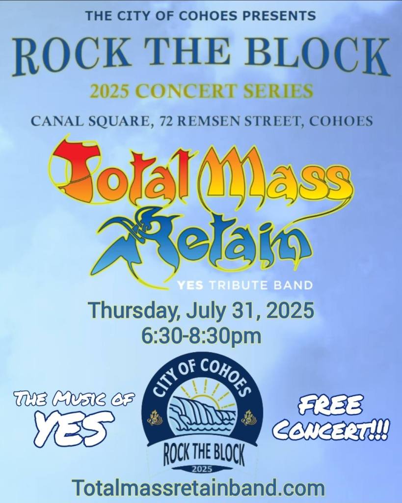 Total Mass Retain, a Yes Tribute Band, is performing at the same venue on Thursday, July 31 at 6:30 p.m. Note: This is a free concert.