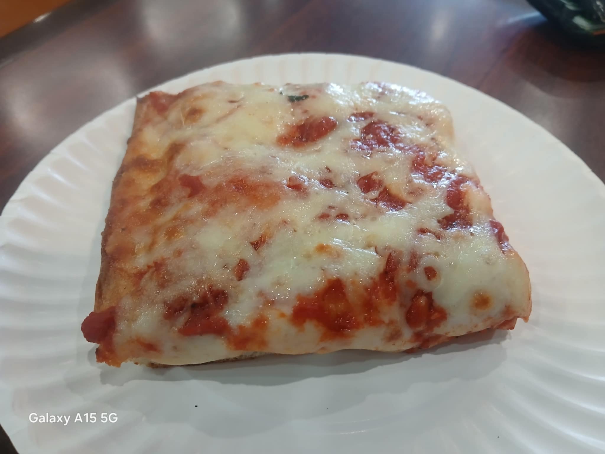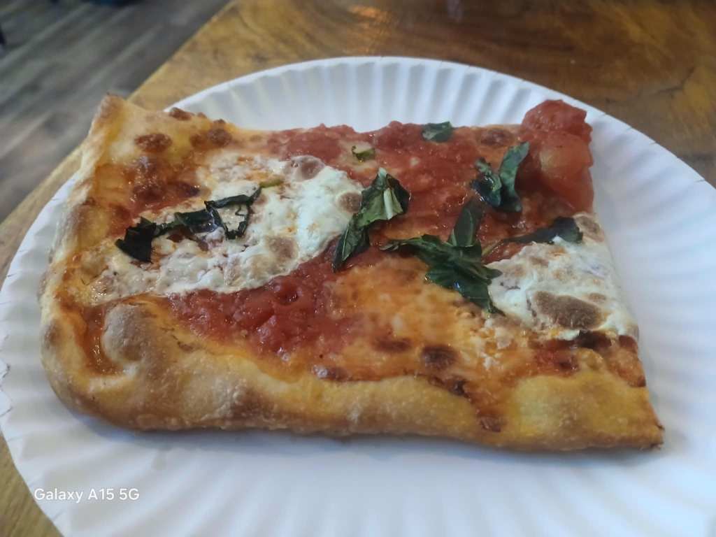Maggie had a grandma square (pictured over to the right), a thin crusted variety made with plum tomato sauce topped with areas of fresh mozzarella cheese, olive oil and basil.
