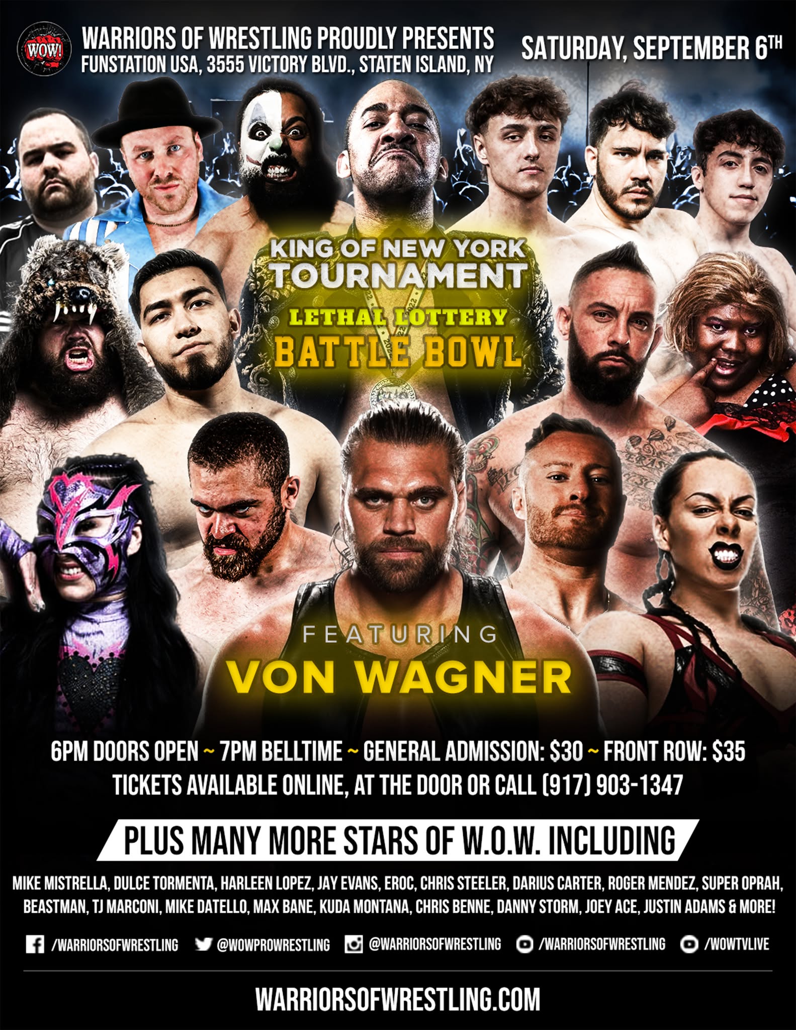 Warriors of Wrestling (W.O.W) returns with its highly anticipated annual event, “King of New York Tournament,” taking place on Friday, September 6th at 6:00 p.m. The action unfolds at Funtime USA, located at 3555 Victory Blvd., Staten Island, N.Y.