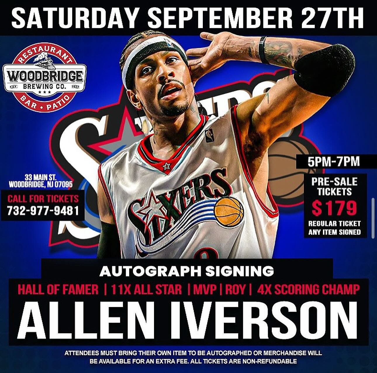 On Saturday, September 27th, from 5:00 p.m. to 7:00 p.m., Naismith Memorial Basketball Hall of Famer Allen Iverson will be appearing at Woodbridge Brewing Co.