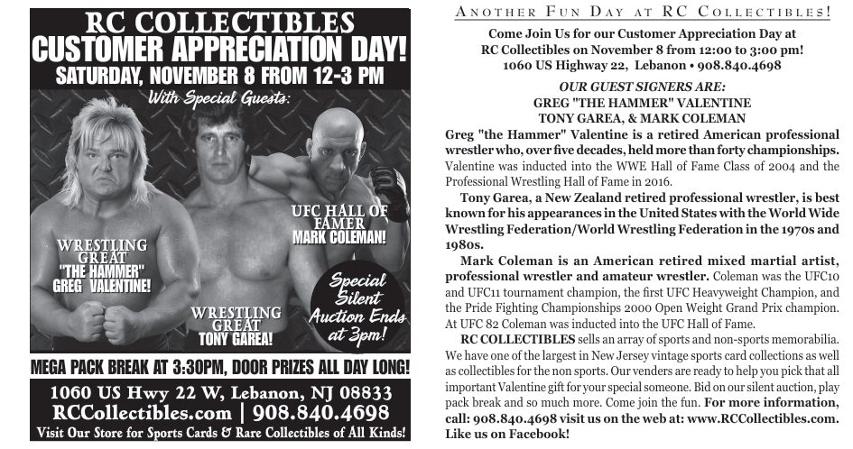 On Saturday, November 8th, from noon to 3:00 p.m., three combat sports athletes– former professional wrestlers Greg “The Hammer” Valentine and Tony Gerea, and UFC Hall of Famer Mark Coleman–will appearing at RC Collectibles (1060 US Highway 22 W Lebanon, N.J.) as part of customer appreciation day.