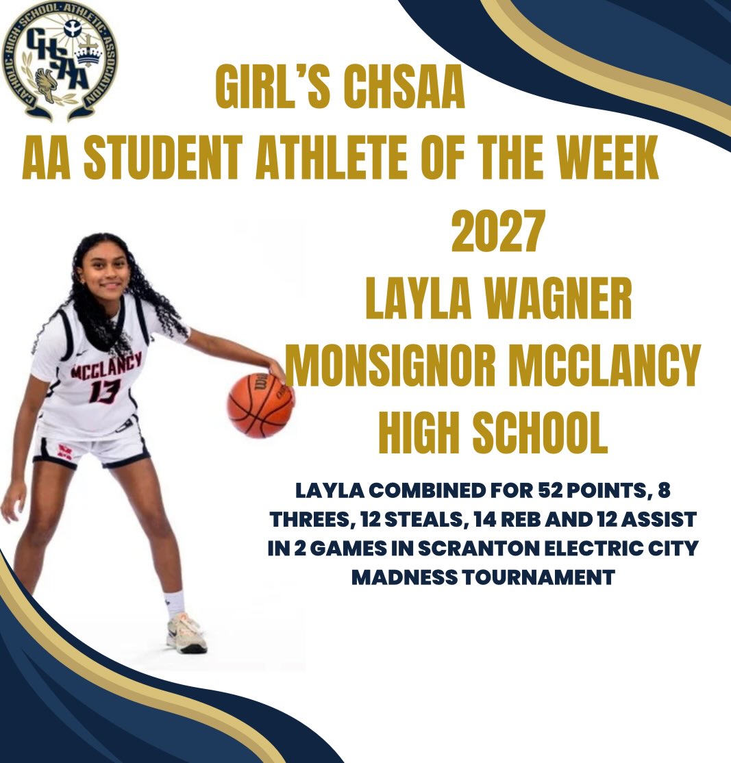 Monsignor McClancy High School (Queens, N.Y.) junior Layla Wagner has earned the Girl’s Catholic High School Athletic Association (CHSAA) AA Student-Athlete of the Week honor, while Notre Dame Academy High School’s (Staten Island, N.Y.) Parker Huang picked up the same accolade for the CHSAA’s Class A Division, yesterday the league announced via Facebook,