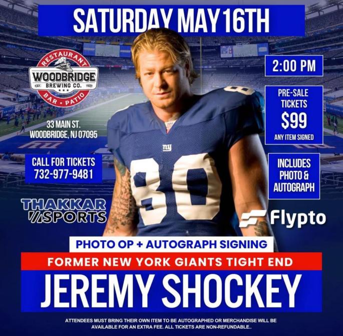 Three former New York Giants Super Bowl champions, Jeremy Shockey, Carl Banks, and Lawrence Taylor, will host meet-and-greet events in New Jersey this May, with tickets priced between $99 and $149, including autographs and photos.