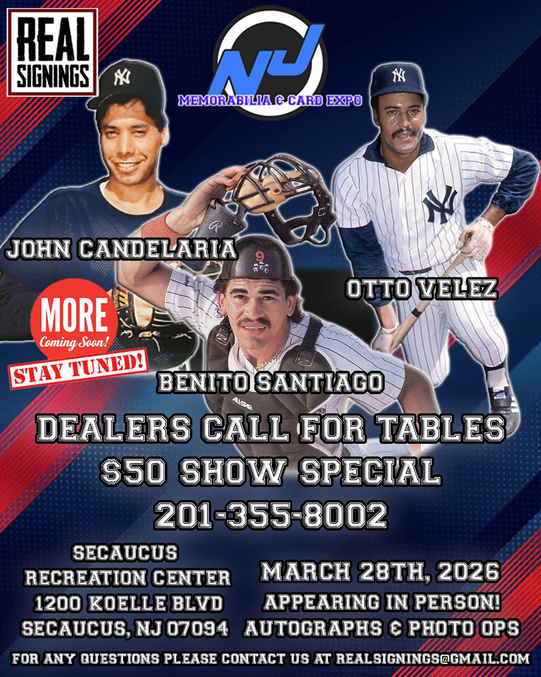 On Saturday, March 28th, 11’00 a.m. to 1:00 p.m., two former New York Yankees — pitcher John Candelaria and utility player Otto Velez, as well ex-MLB catcher Bentio Santiago — will be appearing at the New Jersey Memorabilia and Cards Expo at the Secaucus Recreation Center (1200 Koelle Blvd. Secaucus, New Jersey), brought to you by Real Signings.