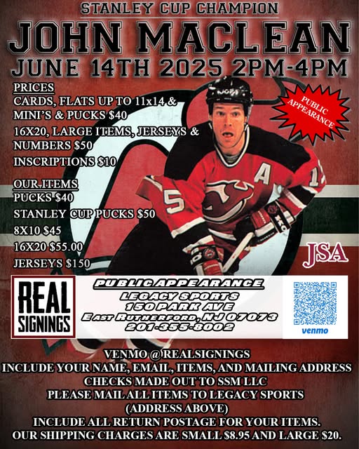 Former NHL player John MacLean will appear at Legacy Sports on June 14th, charging $40-$150 for autographs. He scored 842 points in his career, mainly with the New Jersey Devils.
