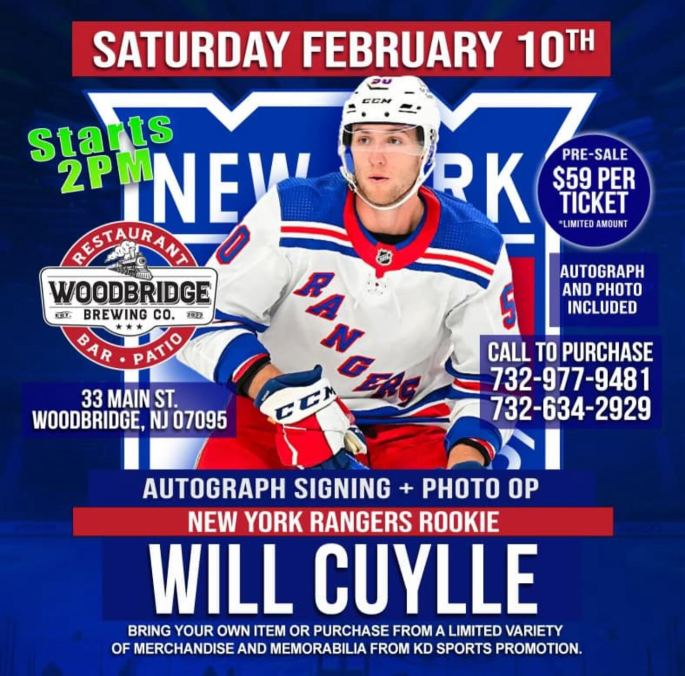 On January 24th, from 6:00 p.m. to 8:00 p.m., New York Rangers players Ryan Lindgren and Jimmy Vesey will attend a meet and greet at Woodbridge Brewing Co. Autograph tickets cost $99.