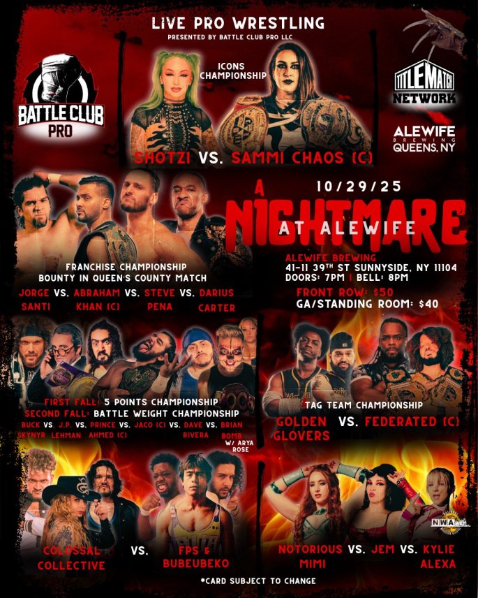 On October 29th at 8:00 p.m., Batlle Club Pro hosts Nightmare at Alewife Brewing featuring six matches, including title defenses and special bouts, with ticket prices at $50 for front row and $40 general admission.
