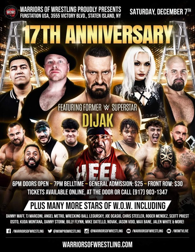 Warriors of Wrestling celebrates its 17th Anniversary on December 7th in Staten Island, featuring notable matches, including Dijack vs. Marconi and Angel Metro defending her title against Joe Bellini, promising thrilling confrontations.