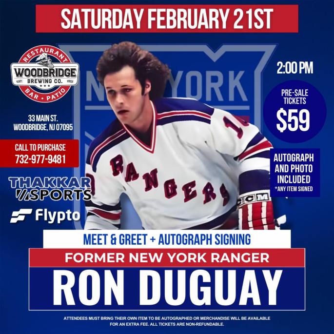 On February 21st, Ron Duguay will host a meet-and-greet at Woodbridge Brewing Co. for $59, including an autograph and photo. Attendees must bring memorabilia; sports items will be available for purchase.