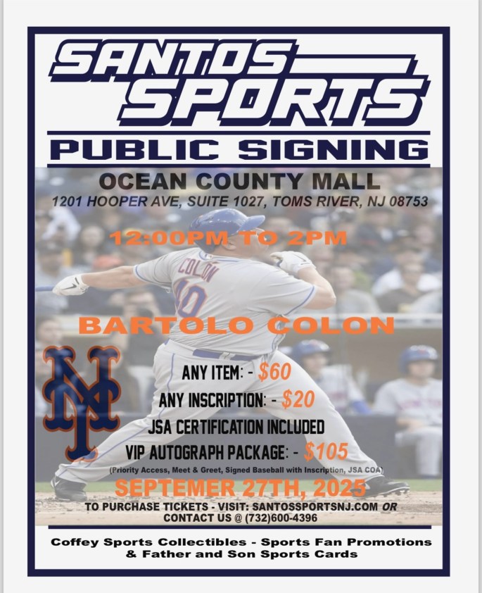 Bartolo Colon, former New York Mets pitcher, will sign autographs on September 27th at Santos Sports, Toms River, NJ. Items cost $60, with inscriptions for an extra $20, including JSA certification.