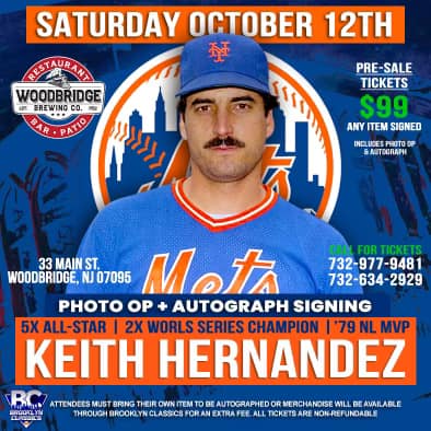 Meet former New York Mets' star Keith Hernandez at Woodbridge Brewing Co. on October 12th for $99. Get an autograph and photo, and buy memorabilia. Known for a stellar career with the Mets and Cardinals. Non-refundable tickets. For more info and tickets, visit woodbridgebrewingco.com or call (732) 634-2929.