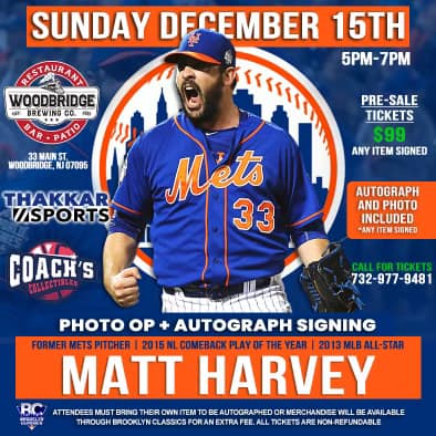 On December 15th, Woodbridge Brewing Co. will host a signing event with former Mets pitcher Matt Harvey from 5-7 p.m. Tickets are $99, including an autograph and photo opportunity.