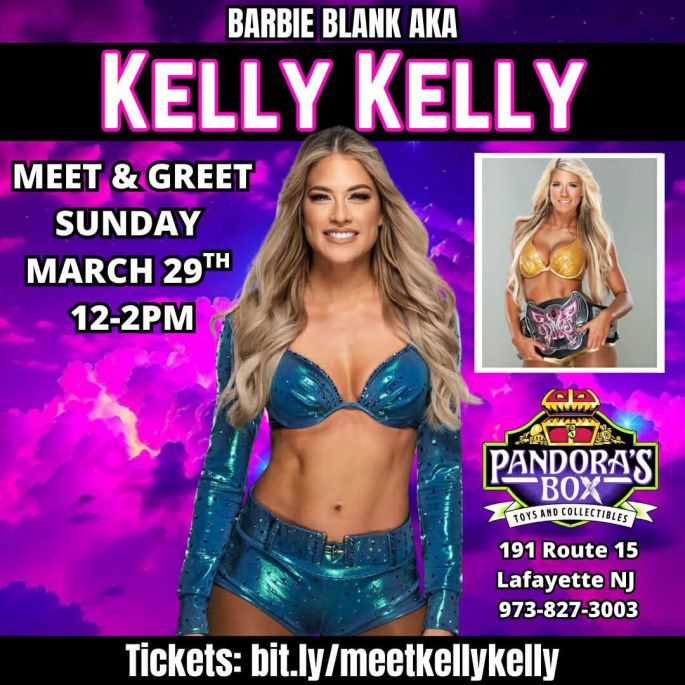 On March 28th, Kelly Kelly (Barbie Blank), a former WWE Divas Champion, will appear at Pandor's Box Toys in Lafayette, N.J. Prices for autographs and photos range from $33.85 to $81.88.