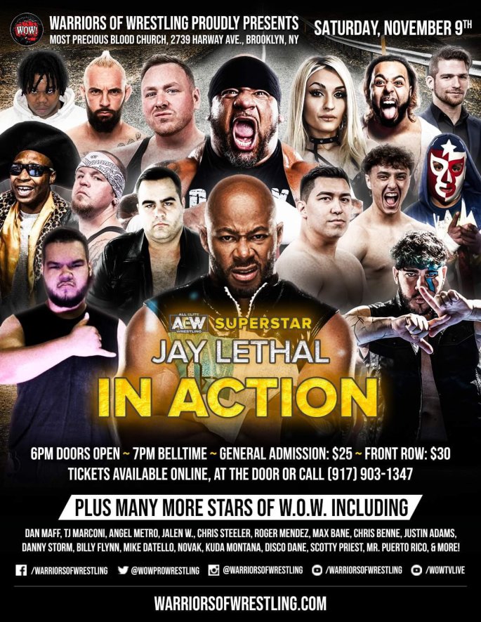 Warriors of Wrestling returns on November 9th at 7:00 p.m. in Brooklyn, featuring AEW's Jay Lethal vs. Mike Datello, heavyweight title match Dan Maff vs. TJ Marconi, and more. Tickets available online.