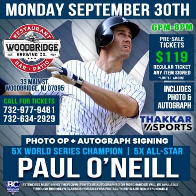 Paul O'Neil, New York Yankee legend, will be at Woodbridge Brewing Co. on Sept 30, 6-8 p.m. $119 for autograph and photo. Limited tickets, non-refundable. Bring own memorabilia or buy at the event. For more info, call 732-977-9481 or visit woodbridgebrewingco.com.
