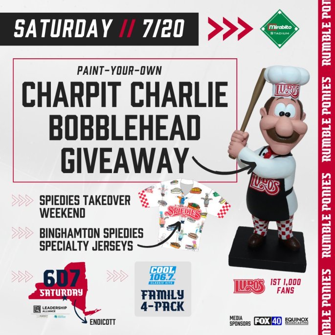On July 20th, the first 1,000 fans at Mirabito Stadium will get a unique Charpit Charlie bobblehead with paint supplies. The iconic Charpit restaurant in Binghamton closed in January 2023 after 45 years.
