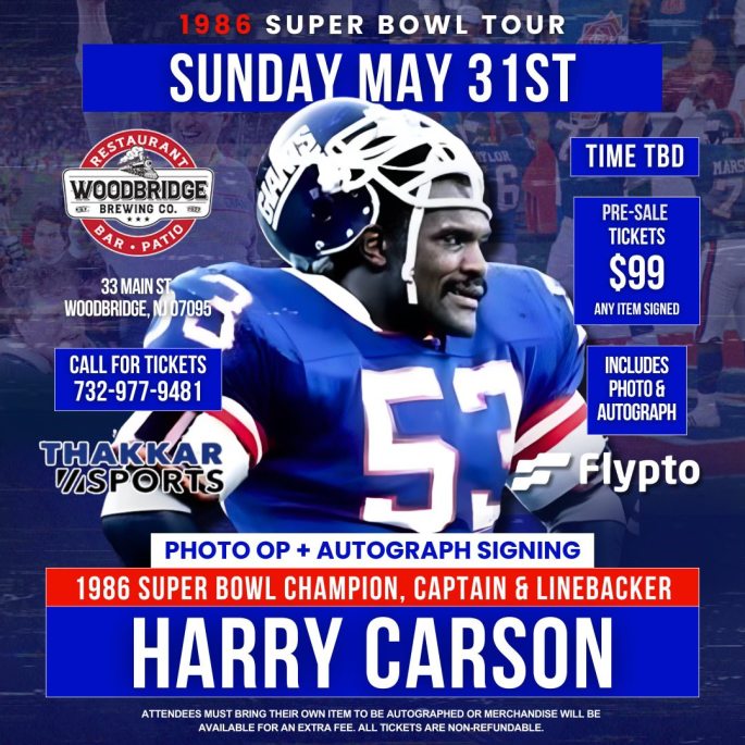 On May 31st, Harry Carson, former Giants linebacker, will host a meet-and-greet at Woodbridge Brewing Co. for $99, including an autograph and photo. Call 732-977-9481 for tickets.