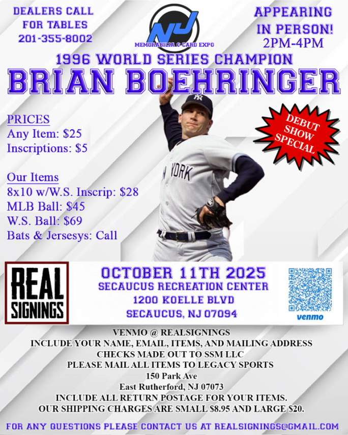On October 11th, Brian Boehringer, ex-New York Yankee, will sign autographs at Secaucus Recreation Center. Admission is $5; autographs cost $25. Mail orders and various item prices available through Real Signings.