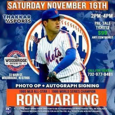 Ron Darling, the 1986 World Series champion, will sign autographs on November 16th at Woodbridge Brewing Co. Tickets are $99, including an autograph and photo opportunity with him.