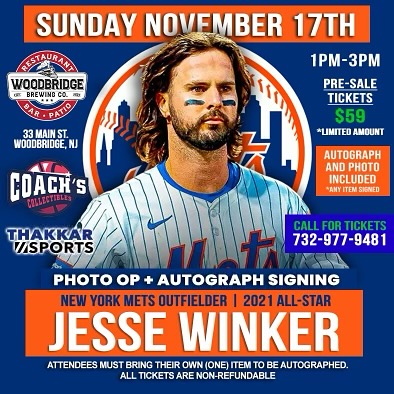Jesse Winker, New York Mets outfielder, will meet fans at Woodbridge Brewing Co on November 17th, from 1:00 p.m. to 3:00 p.m. Tickets cost $59 and include an autograph opportunity.